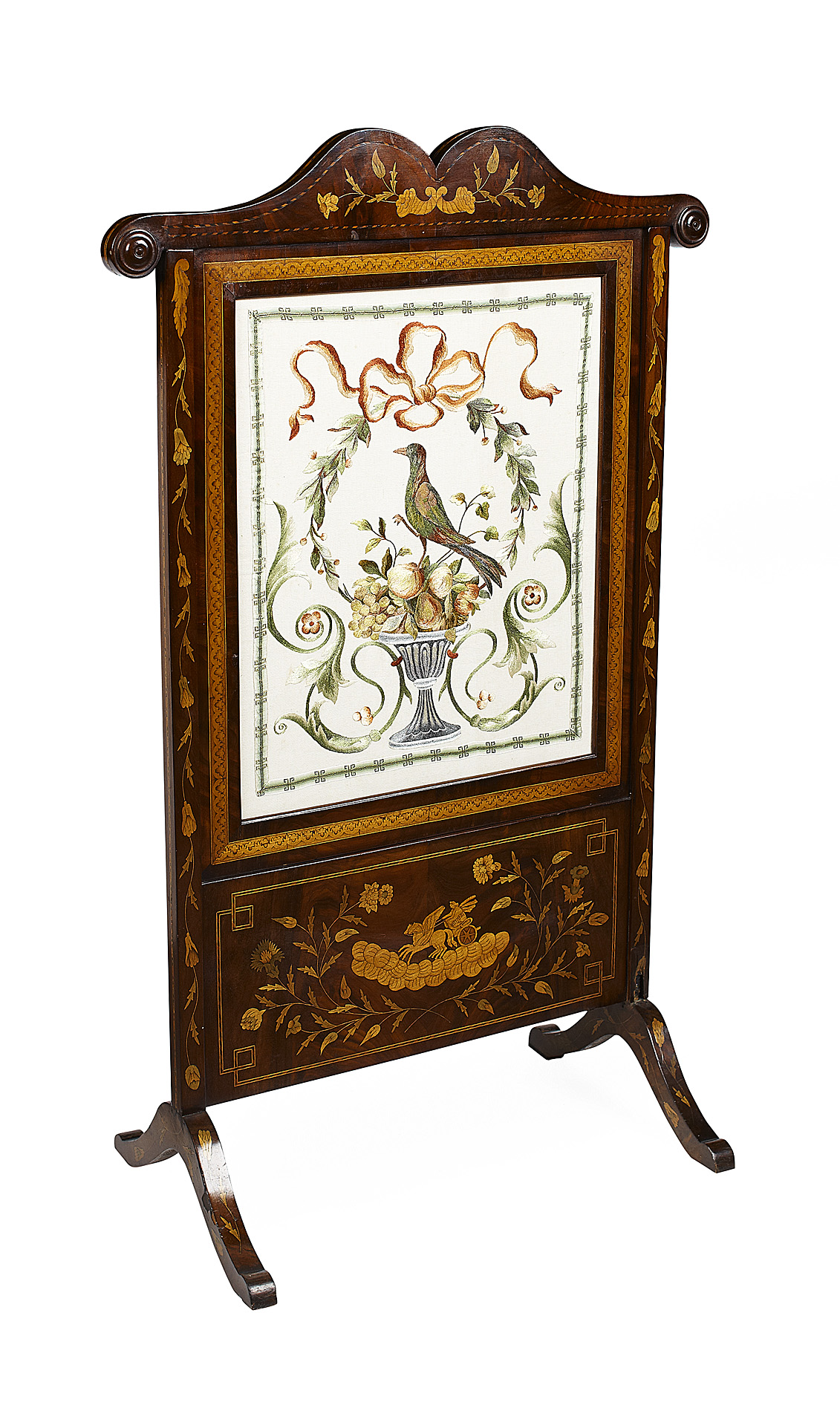 DUTCH MAHOGANY AND MARQUETRY INLAID FIRE SCREEN