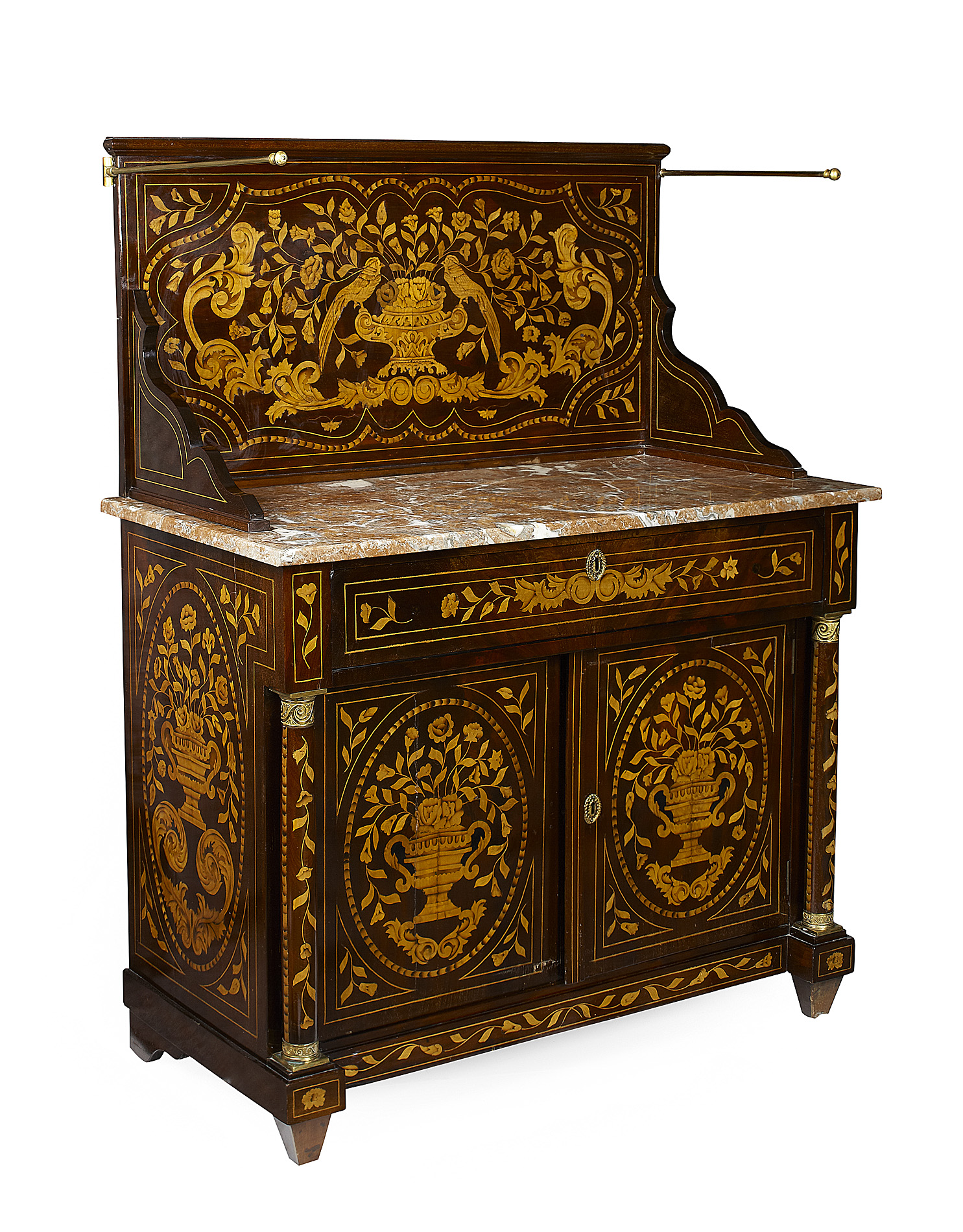 the rectangular back panel with brass towel rails to the sides, over a rouge marble top, above a long drawers and pair of cupboard doors flanked by gilt metal mounted columns, on tapered block feet