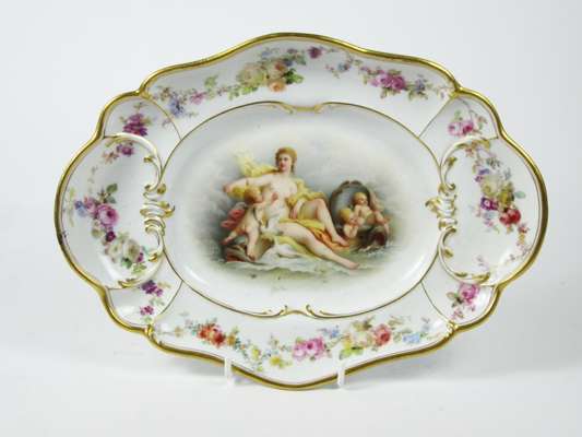 of shaped oval form, with a painted scene of Venus with putti surrounded by flower sprigs and sprays and gilded borders, incised and crossed swords marks