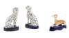 each modelled in a sitting position with gilt highlights, on a blue painted base, marks to underside; and a STAFFORDSHIRE GREYHOUND, modelled recumbent, on a blue painted base (3)