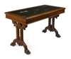 The green insert leather writing surface over a single frieze drawer with a carved arched detail, raised on side supports ending on hairy paw feet