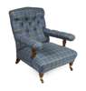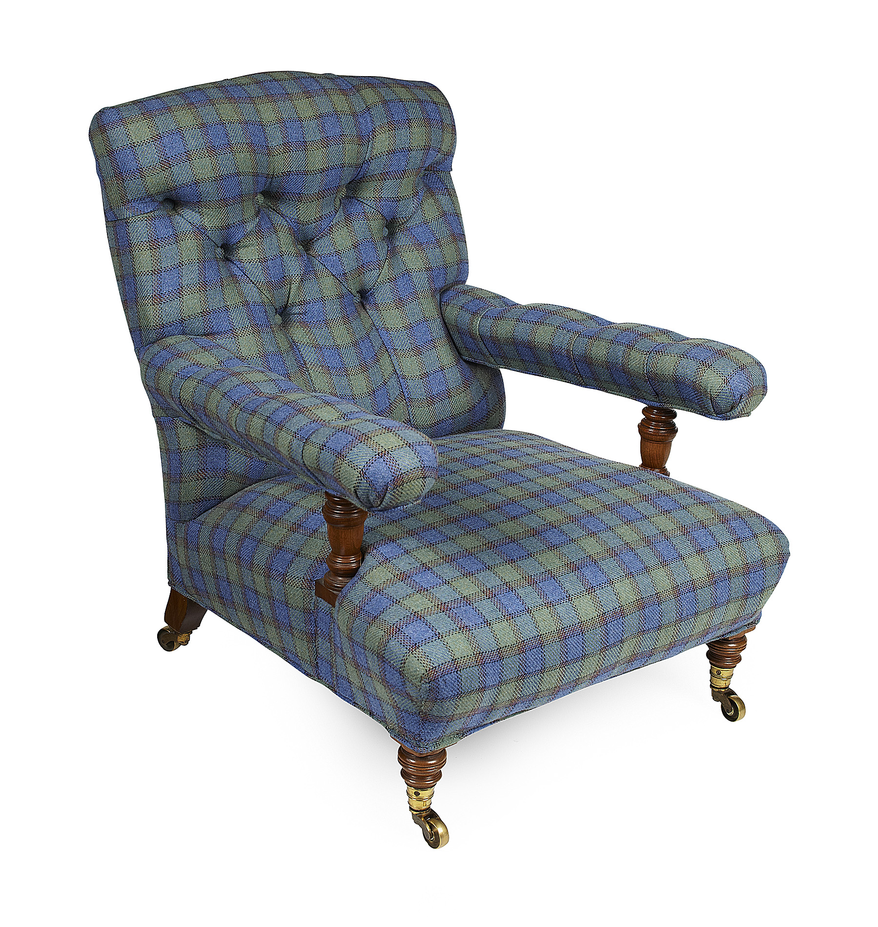 covered in unique Blair tweed fabric, with button tufted back and open arms, raised on turned legs with brass caps and castors, stamped
