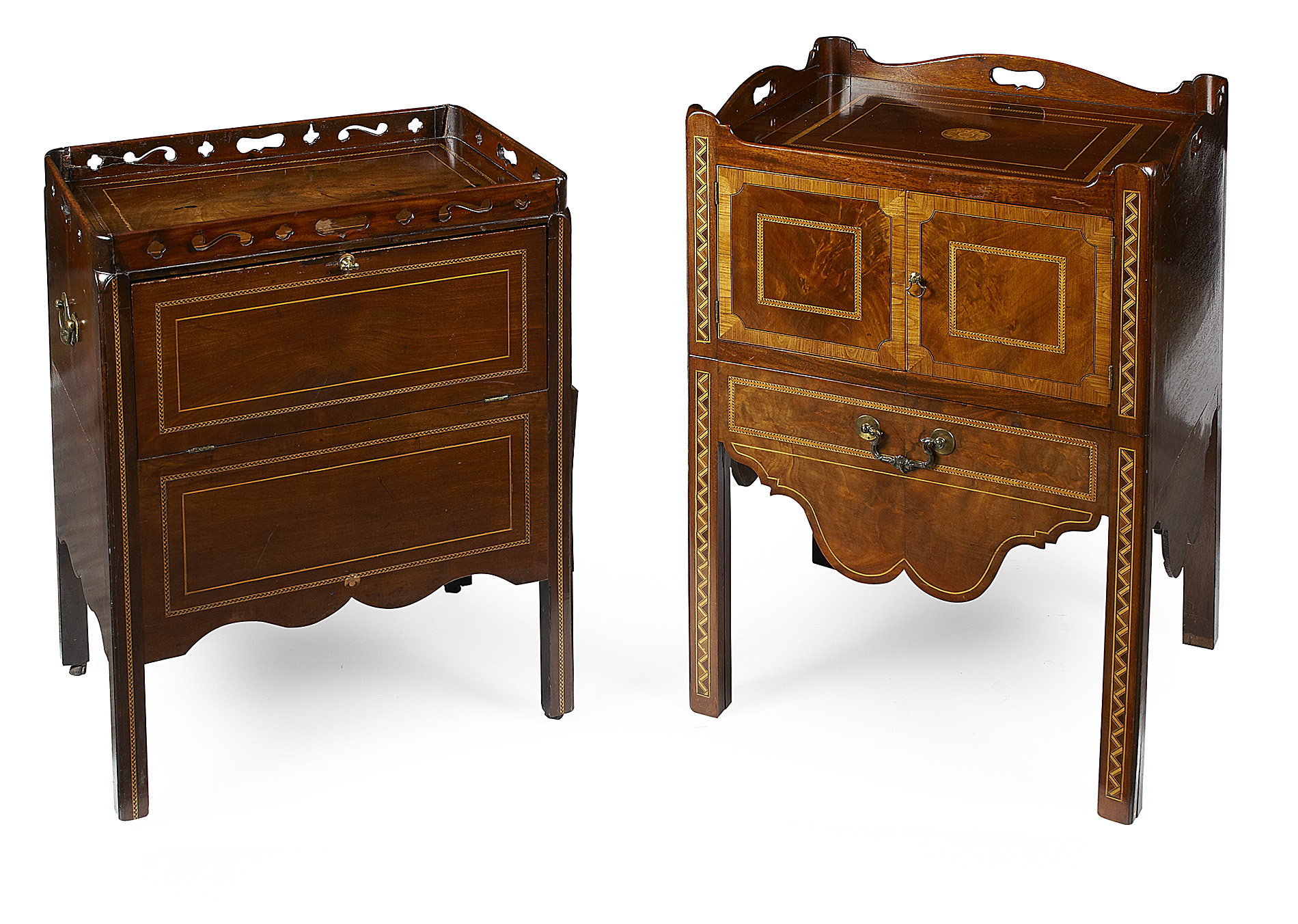 the first with a serpentine gallery with handle cut-outs over a pair of doors and pull-out base fitted with a pottery commode, on square legs the whole with crossbanding and parquetry line inlay; the other with a pierced gallery and fall front cupboard door over a deep apron, on square legs, with chevron and line inlay (2)