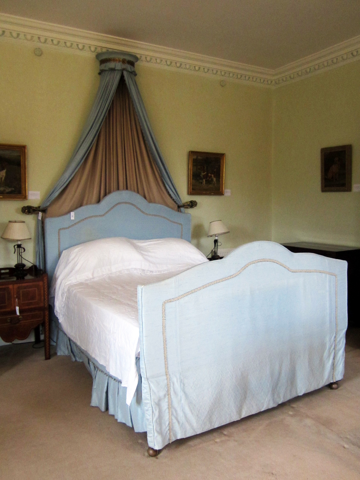 the arched head and footboards upholstered in pale blue silk, on brass legs, the canopy with light blue and brown silk drapery issuing from a brass mounted corona with blue enamel and gilt metal brackets