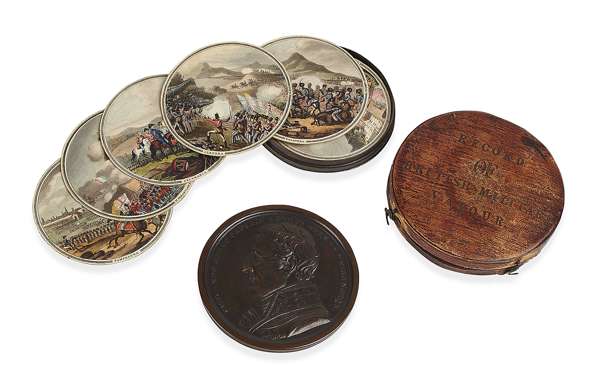 the medal with a profile portrait of Wellington and opening to reveal a series of circular cards printed with his principal battles from 1808-1814, in fitted leather case