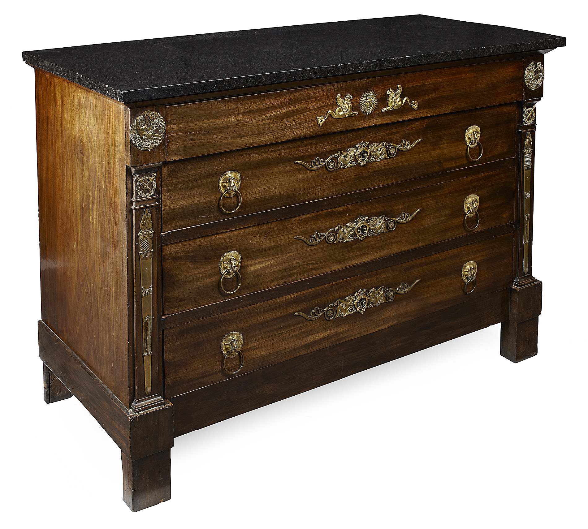 the black marble top over a long frieze drawer above three further long drawers flanked by pilasters, on block feet, applied with neoclassical style mounts throughout