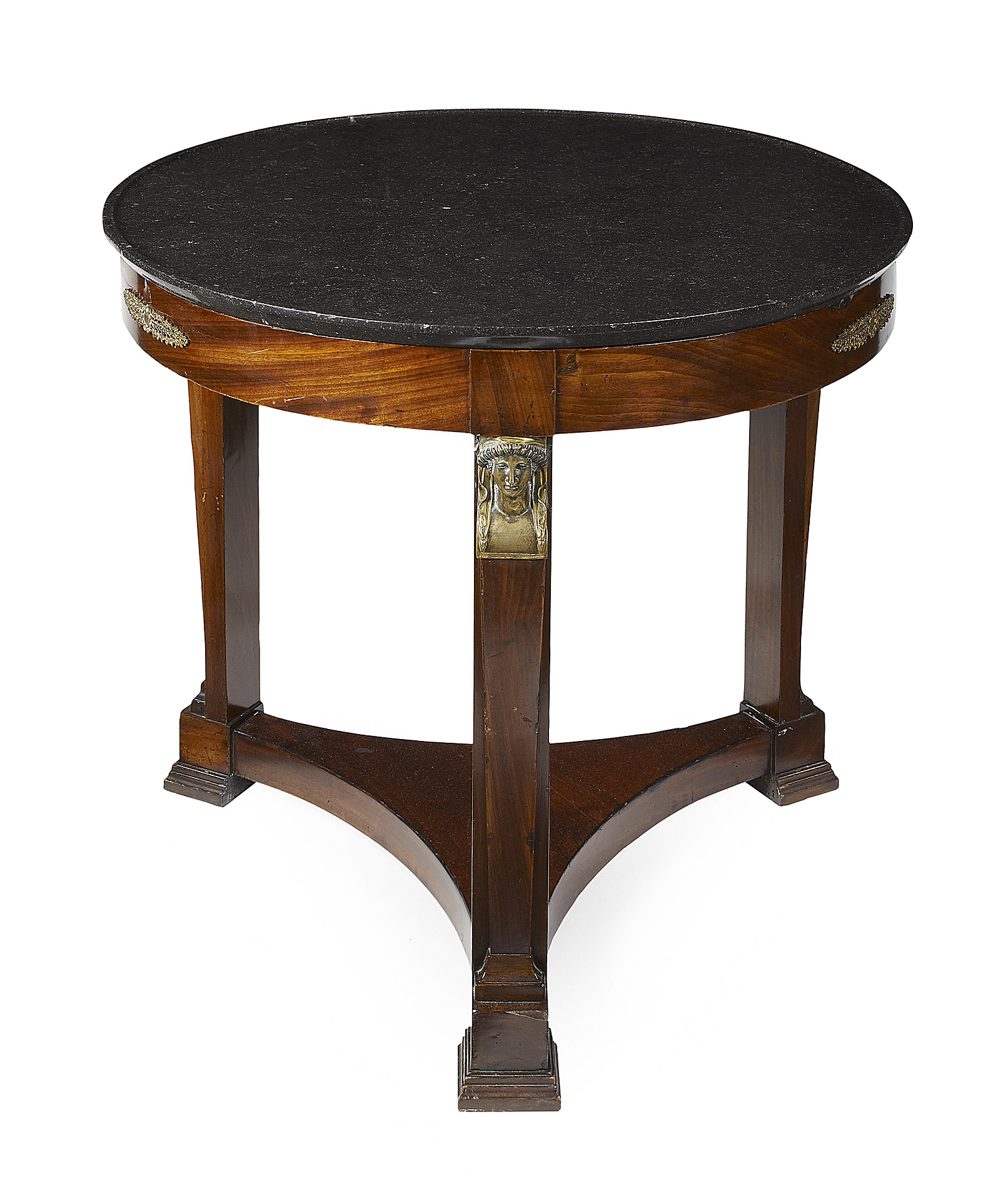 the dished black marble top over a plain frieze raised on square tapered legs headed by gilt metal busts, on block feet joined by a triform undertier