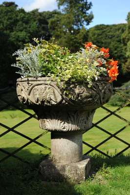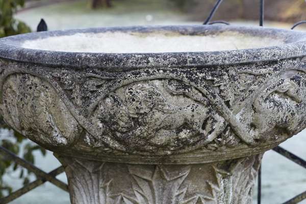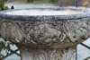 probably adapted from a capital or font, the exterior of the bowl carved with frieze of lions, birds, other beasts and acanthus between vine, over stiff carved acanthus base, on later cylindrical column and square base