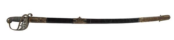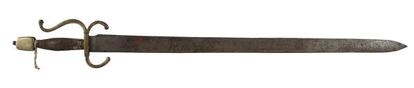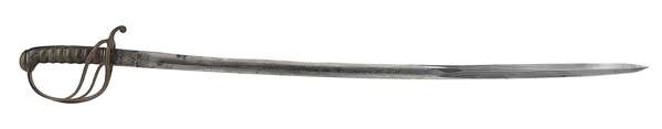 with flat pommel down turned quillions and single bar knuckle guard cloth bound grip flat rigid single edged spear point blade; an 1850 PATTERN ROYAL ARTILLERY OFFICER'S SWORD, in steel scabbard; and an 1822 PATTERN BRASS HILTED OFFICER'S SWORD, Royal Scots Fusiliers, with corroded pipe back blade in brass mounted black leather scabbard (3)