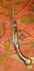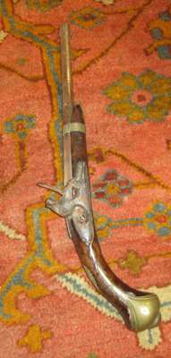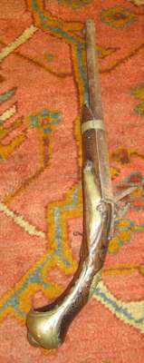 with double wing slab-sided ivory grip, missing silver ferrule mount, applied silver mounts with inset coral beads at ricasso, silver front and back straps inset with tear drop shaped coral beads, inscription and stamp on left side of slightly curved single edged blade in highly decorated with embossed work scabbard; and a BALKAN FLINTLOCK PISTOL, (damaged) with brass mounts missing trigger guard and fore-end of stock (2)
