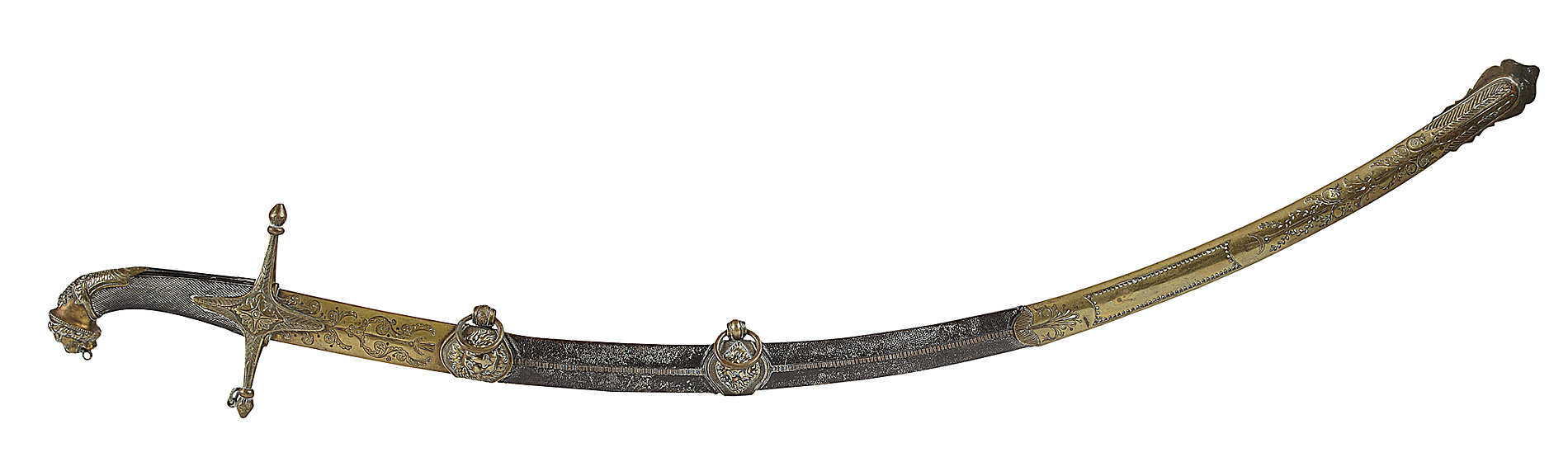 cast brass lion-head pommel, fine chequered wooden grip, marmaluke hilt with gilt brass cross-guard with turned tear drop terminals one with ring for chain guard the curved single edged sabre blade fire blued and gilt for 9inches, engraved brass long locket, lion masks on ring mounts on black leather mounted scabbard