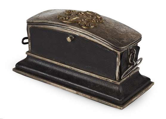 engraved border, applied gilt cypher, converted to a box with fitted gilt interior