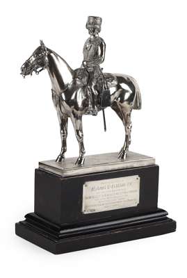 of an officer on his horse, on a stained wood plinth, applied plaque, engraved inscription; 'To Colonel F G Blair...1895-1904'
