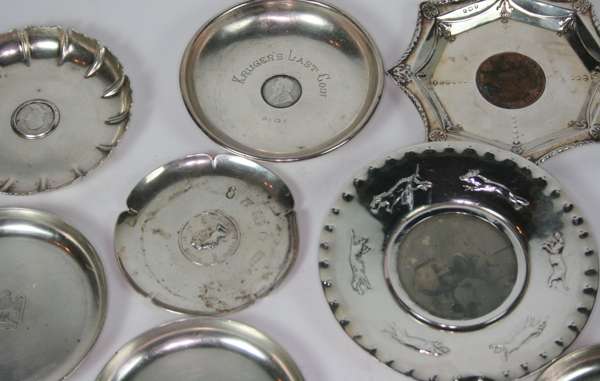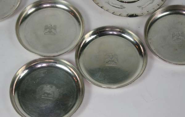 of shallow form regimental badge to centre; together with FOUR OTHER COIN SET DISHES; and ANOTHER ONE, with a photograph (10)