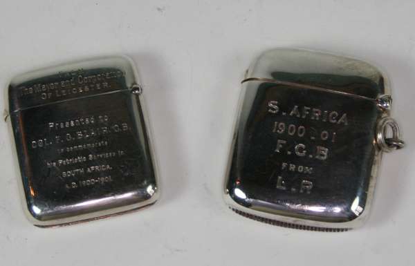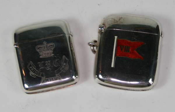 one obverse enameled flag with VIII, reverse engraved S. Africa 1901, FGB from LR, the other engraved Prince Albert's own, reverse with presentation inscription (2)