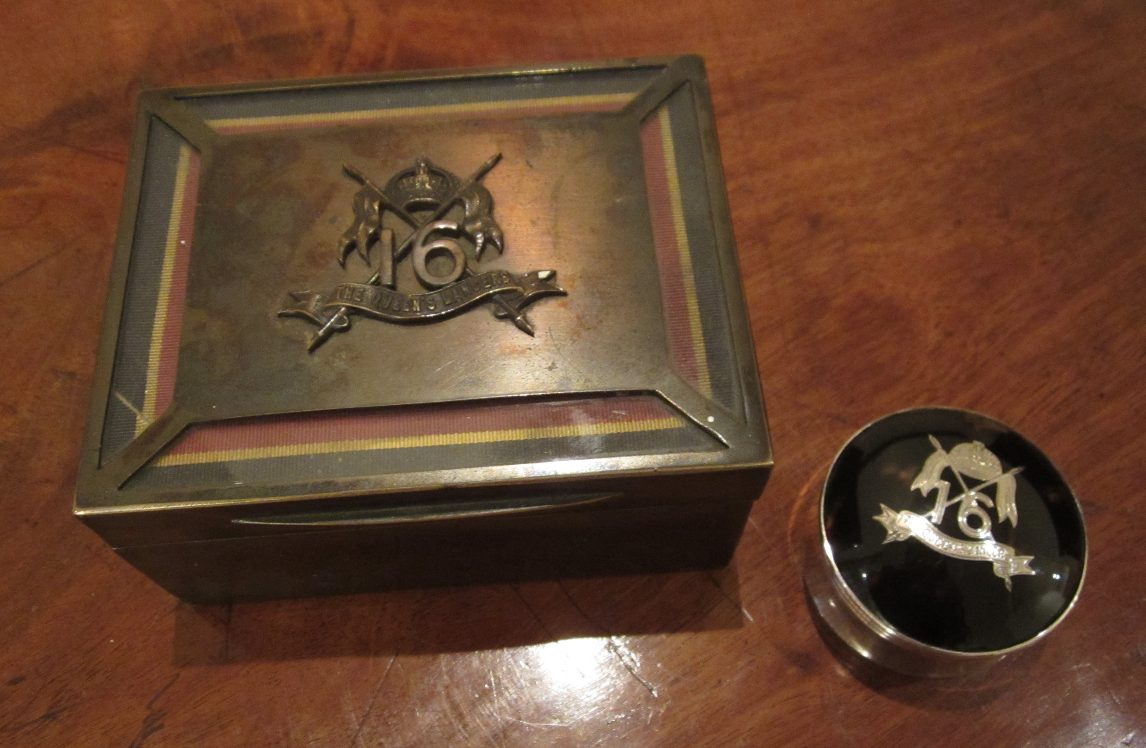 with applied Lancers badge and colours; and a SMALL SILVER BOX, with pique decoration of the 14th Hussars crest and motto (2)