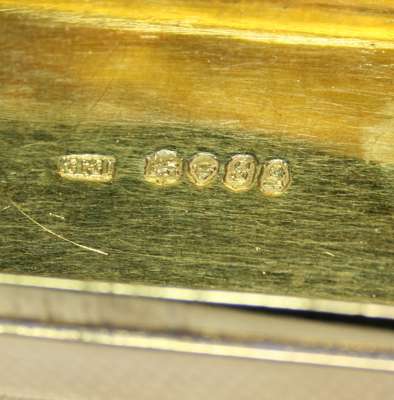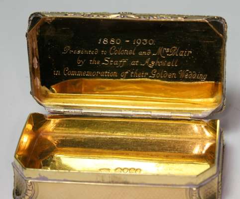 of rectangular form, engine turned ground, cast border, and thumb piece, with a presentation engraved inscription to the interior
