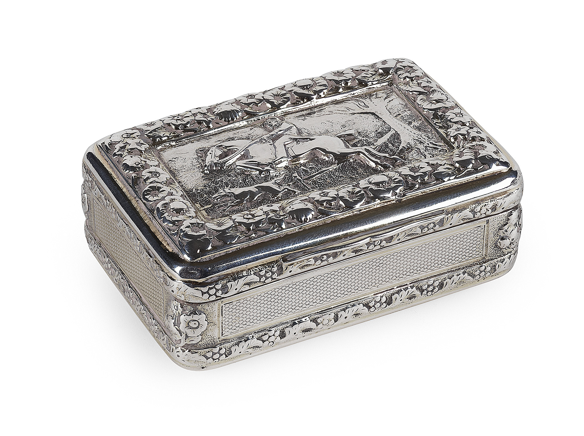 of rectangular form, with a chased panel of Master of the Hounds, within a foliate border, gilt interior, cast lower border, engine turned detail