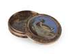 of circular form, gold plain mounts, unmarked, the cover with a circular micro-mosaic panel of a Mallard duck and duckling swimming