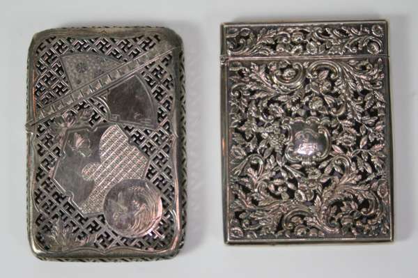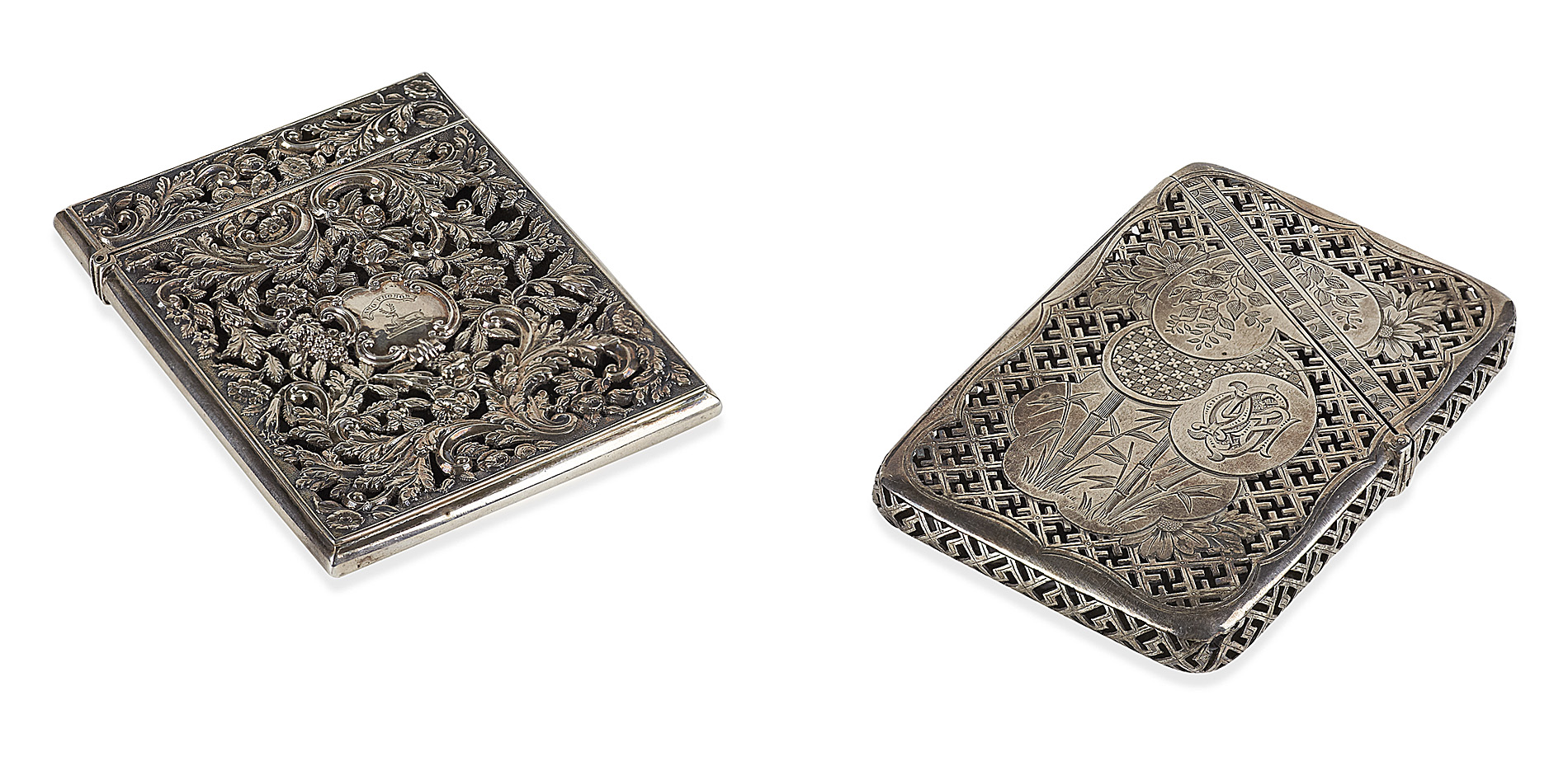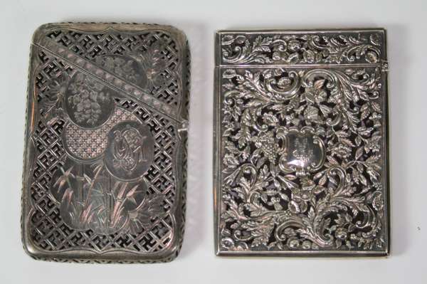 pierced and engraved in Japanese style, engraved monogram; and a WILLIAM IV SILVER CARD CASE, Nathaniel Mills, London 1837, well pierced and chased foliate body (2)