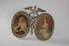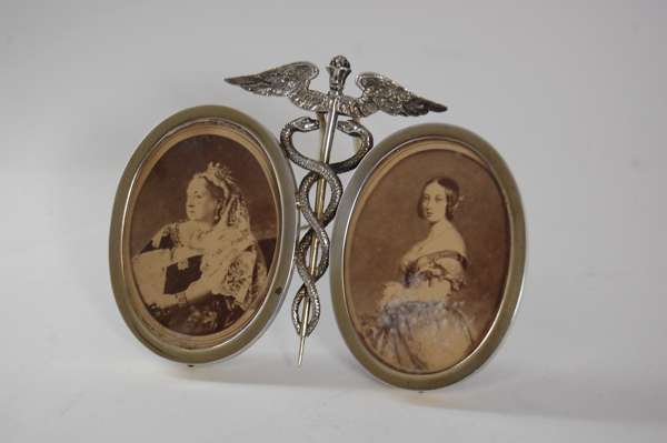 the twin oval frames with central caduceus with strut support, frames containing images of Queen Victoria