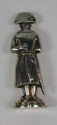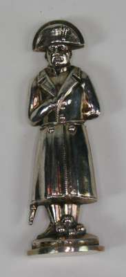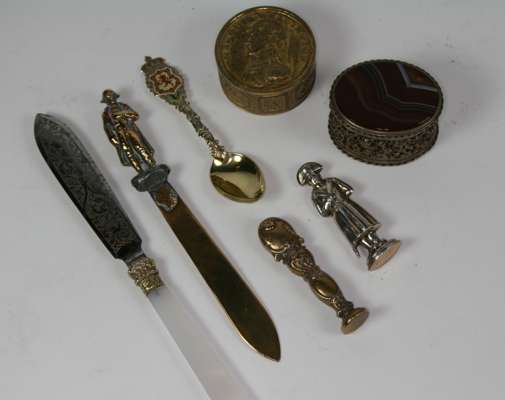 a gilt circular box and cover with profile of Wellington and battle honours; a table seal with pull off cover to hold pencil stub modelled as a standing Napoleon; a brass paper knife with Napoleon; another gilt seal; a silver gilt spoon; agate lidded box; pierced gilt sides and an agate handled paper knife with agate handle (qty)