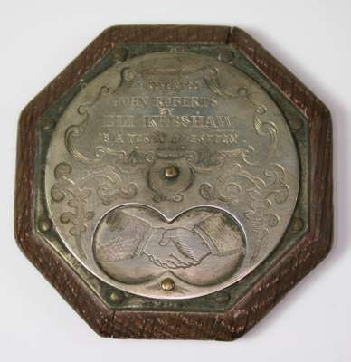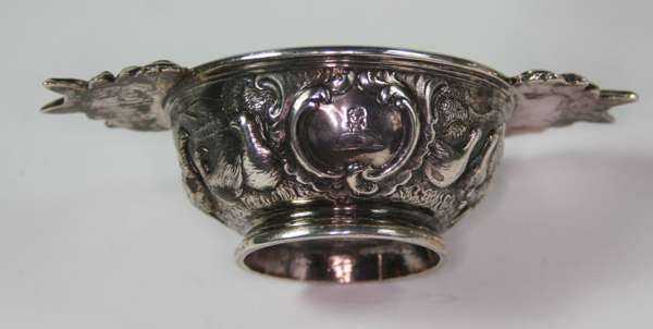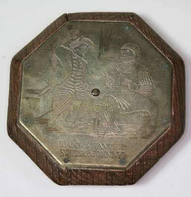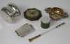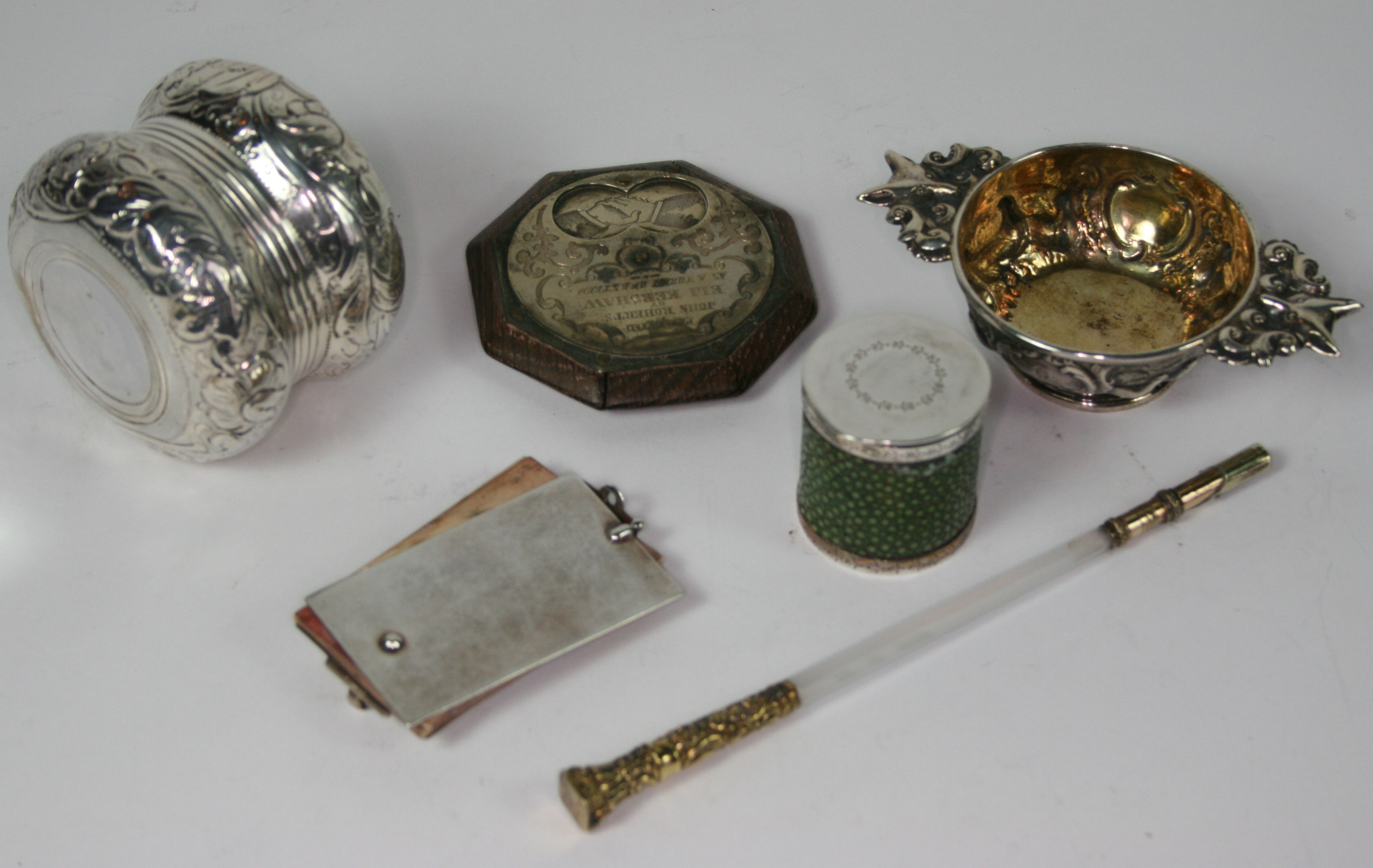 to include: a small quaich, Elder & Co, Edinburgh 1853, decorated fox handles; two silver jar lids, chased floral decoration; a shagreen and plated vesta box and cover of cylindrical form; a silver and ivory aide memoir; an oak and plated mounted snuff box of octagonal form and with Burns' Tam o' Shanter engraved decoration and an agate and silver mounted pen (qty)