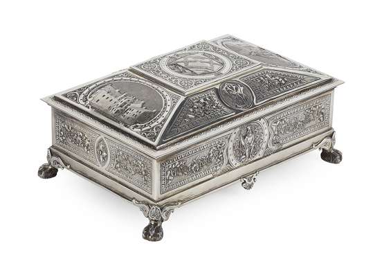 of rectangular form, the domed angled hinged cover decorated with central Blair crest and motto, Blair, another house and monograms, the sides with floral designs, all raised on paw feet