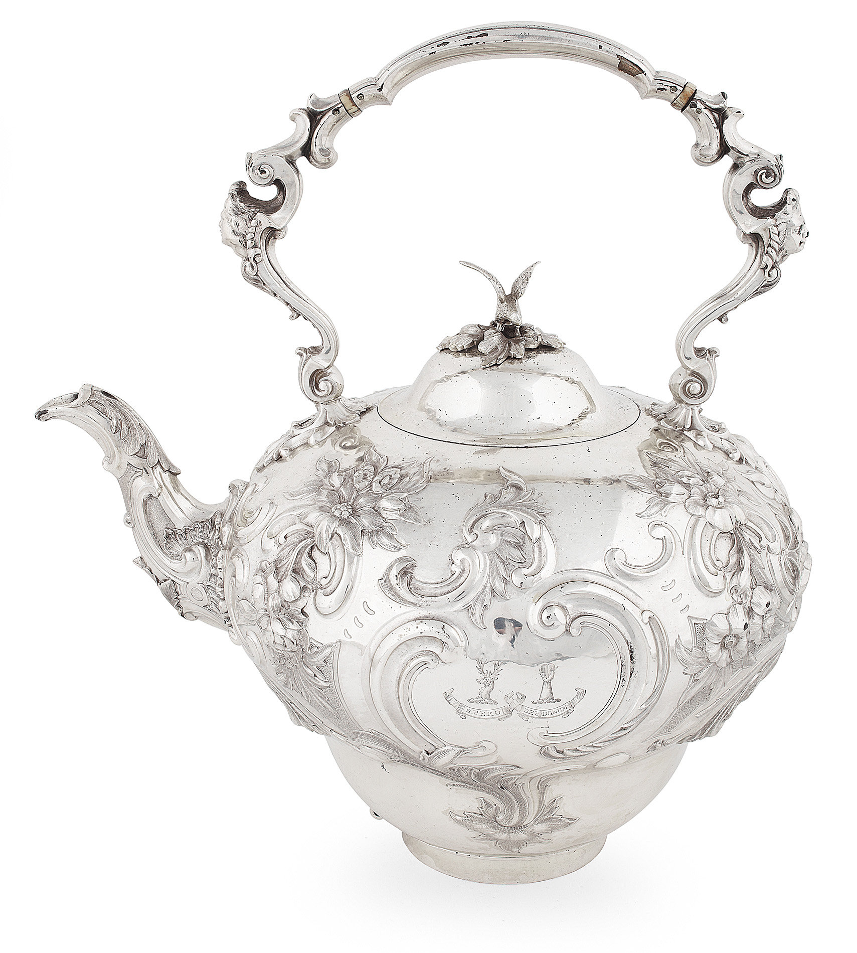 the tapered body with embossed scroll and foliage, the handle and spout similarly decorated, the domed hinged cover with cast bird finial (stand and burner lacking)