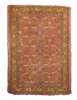 the pink field with allover stylized palmette, lozenge and vine pattern, within orange palmette and vine border between bands