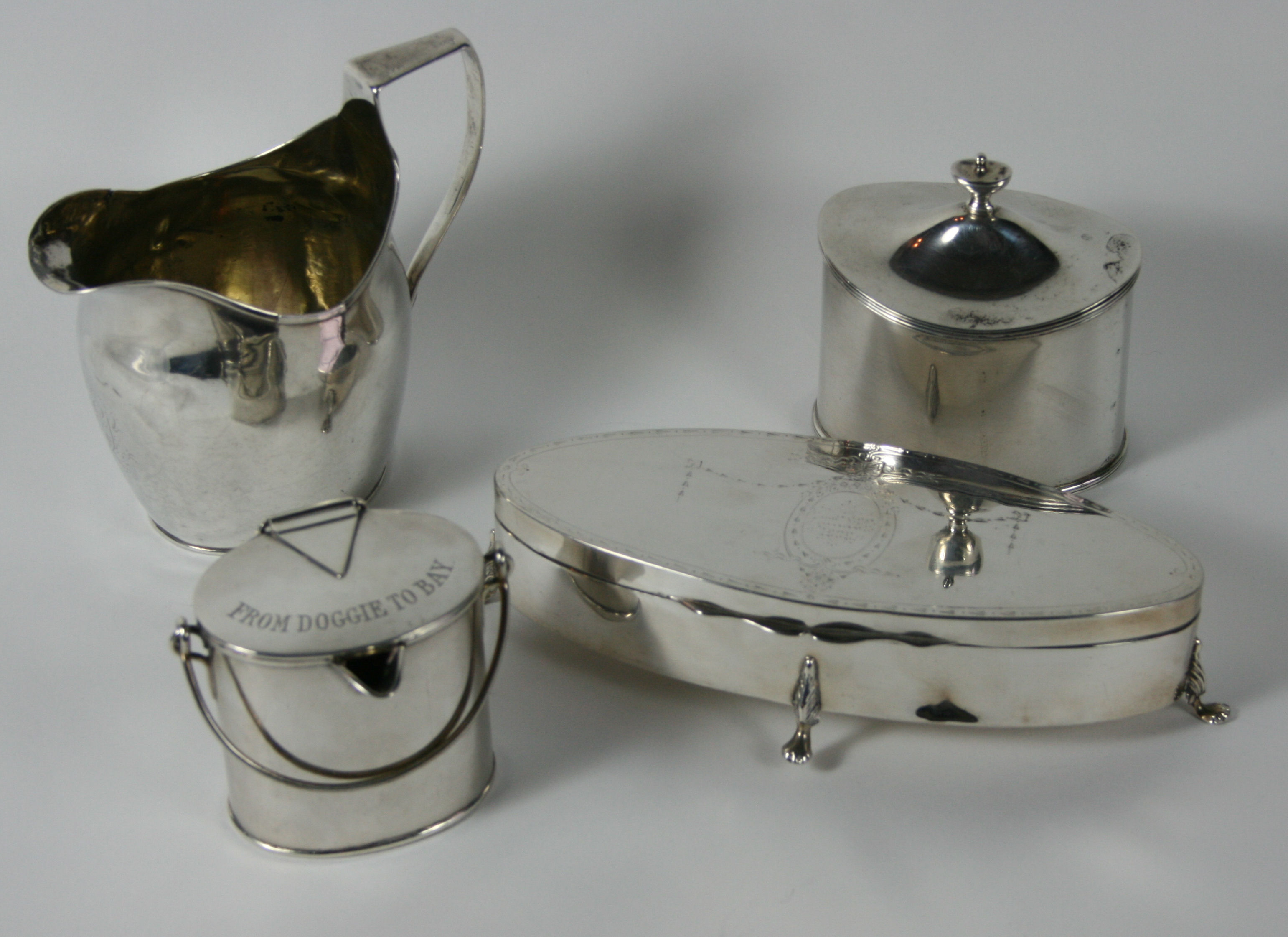 to include: a George II cream jug, an oval lidded sugar box and cover, a large navette shaped jewellery box and cover, an unusual Victorian oval box and cover with pouring lip and belt clip (qty)