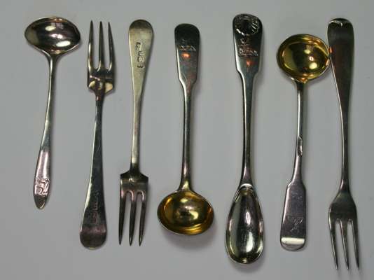 various dates and makers, to include: sugar tongs; six small forks with six similar; and various mustard spoons etc. (qty)