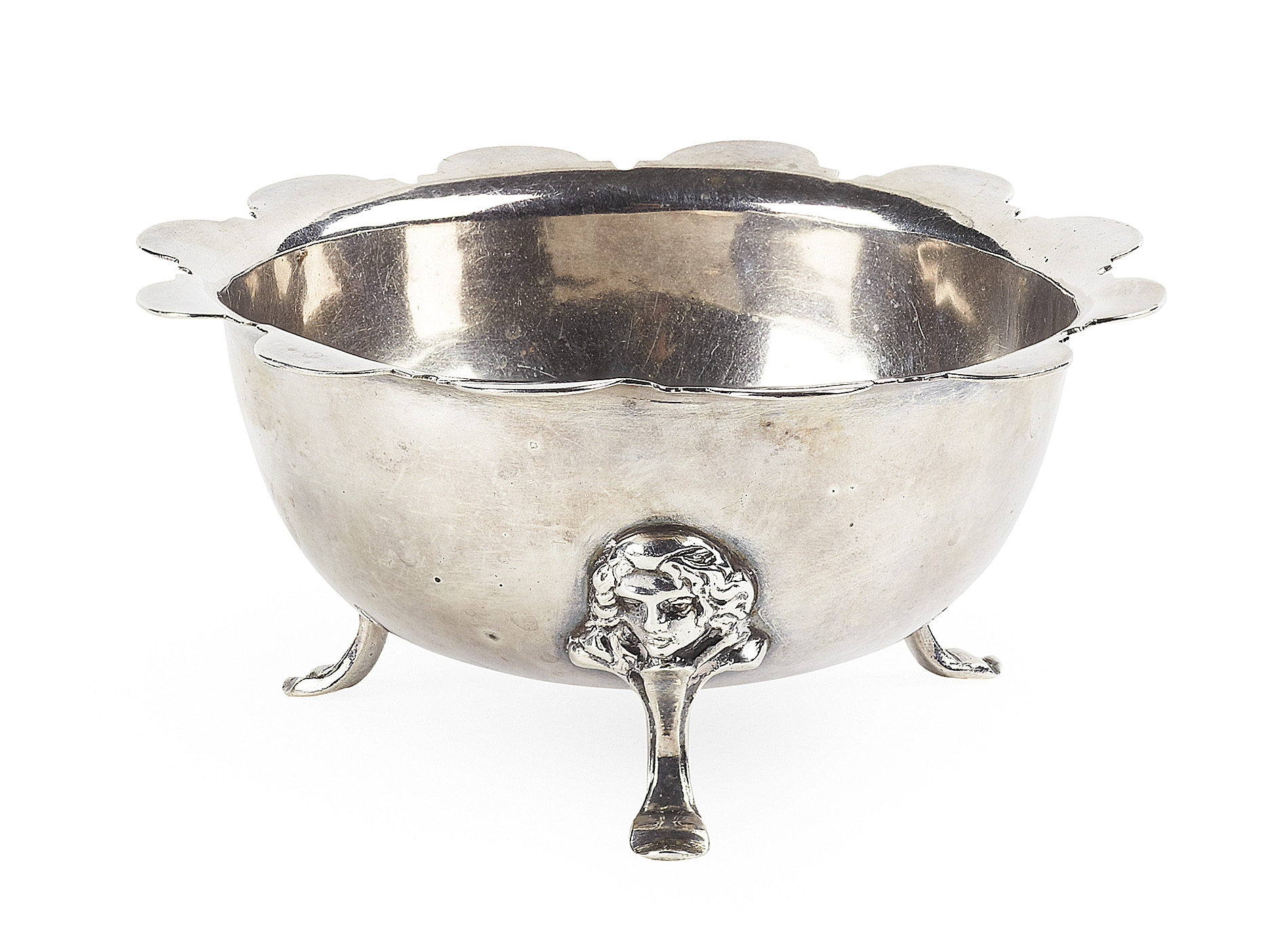 of plain form inverted lobed form, raised on three mask feet