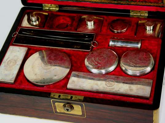 with ten silver mounted boxes and a shaving brush, the covers with engraved crest and motto