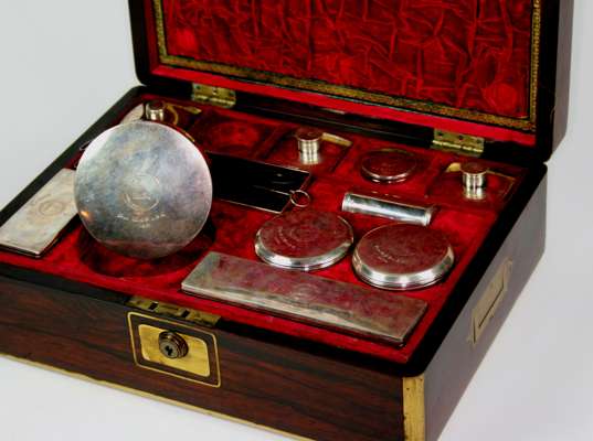 EUROPEAN BRASS-BOUND ROSEWOOD DRESSING TABLE SET