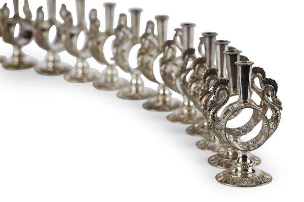 modelled as rings held by winged birds with rising central spill holder, leaf clasped circular base (12)