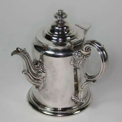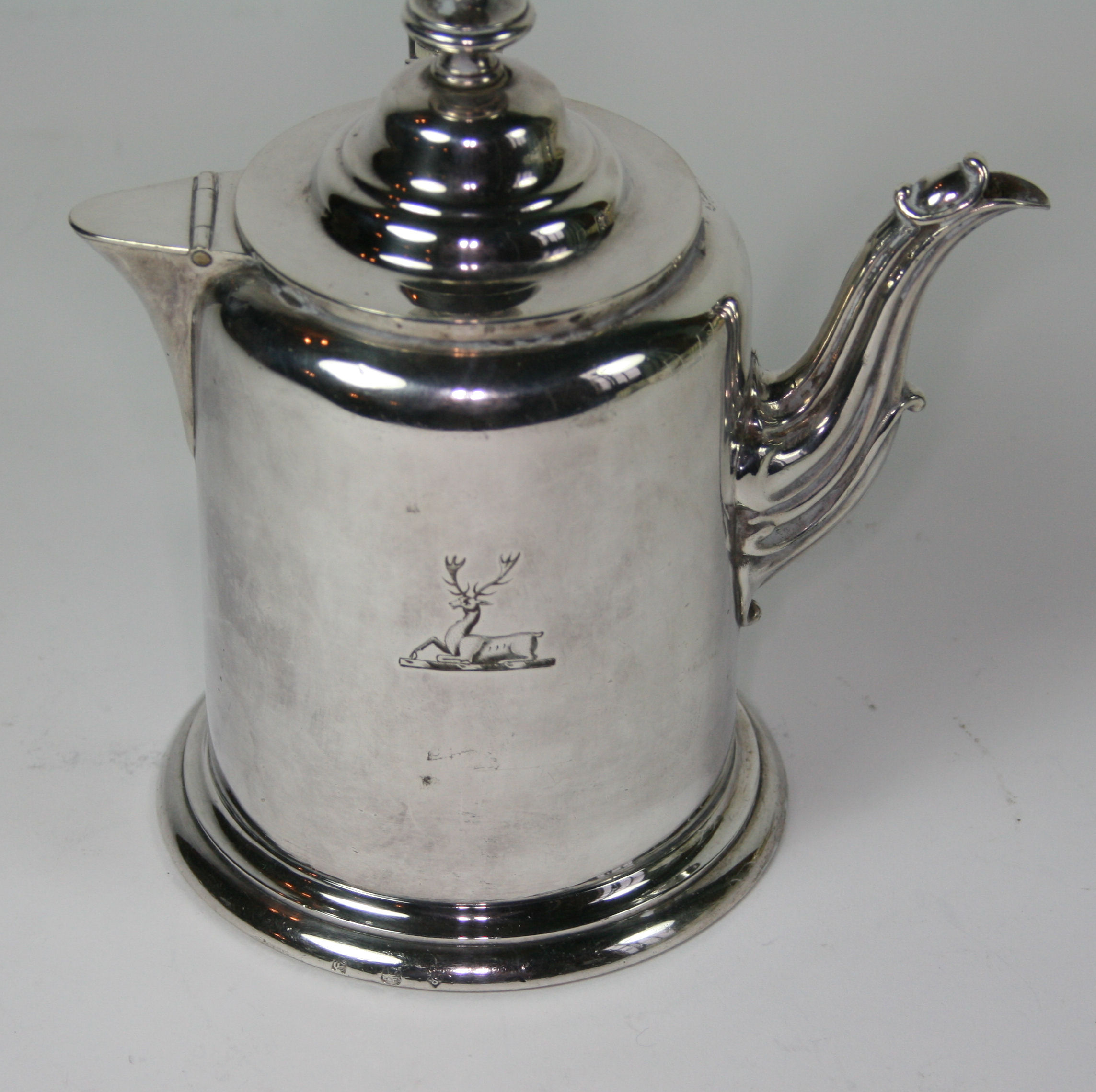 the domed hinged cover with turned finial, clasped spout, the plain body with engraved Blair crest, moulded foot