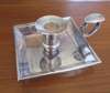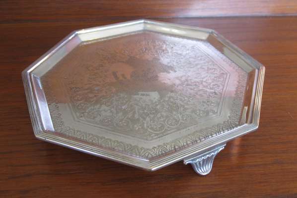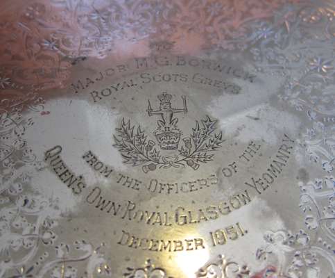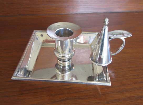 of plain square form, loop handle with engraved crest to the thumb piece, one with a snuffer; together with an octagonal plated small waiter with engraved inscription to 'Major M G Borwick Royal Scots Greys...December 1951' (3)