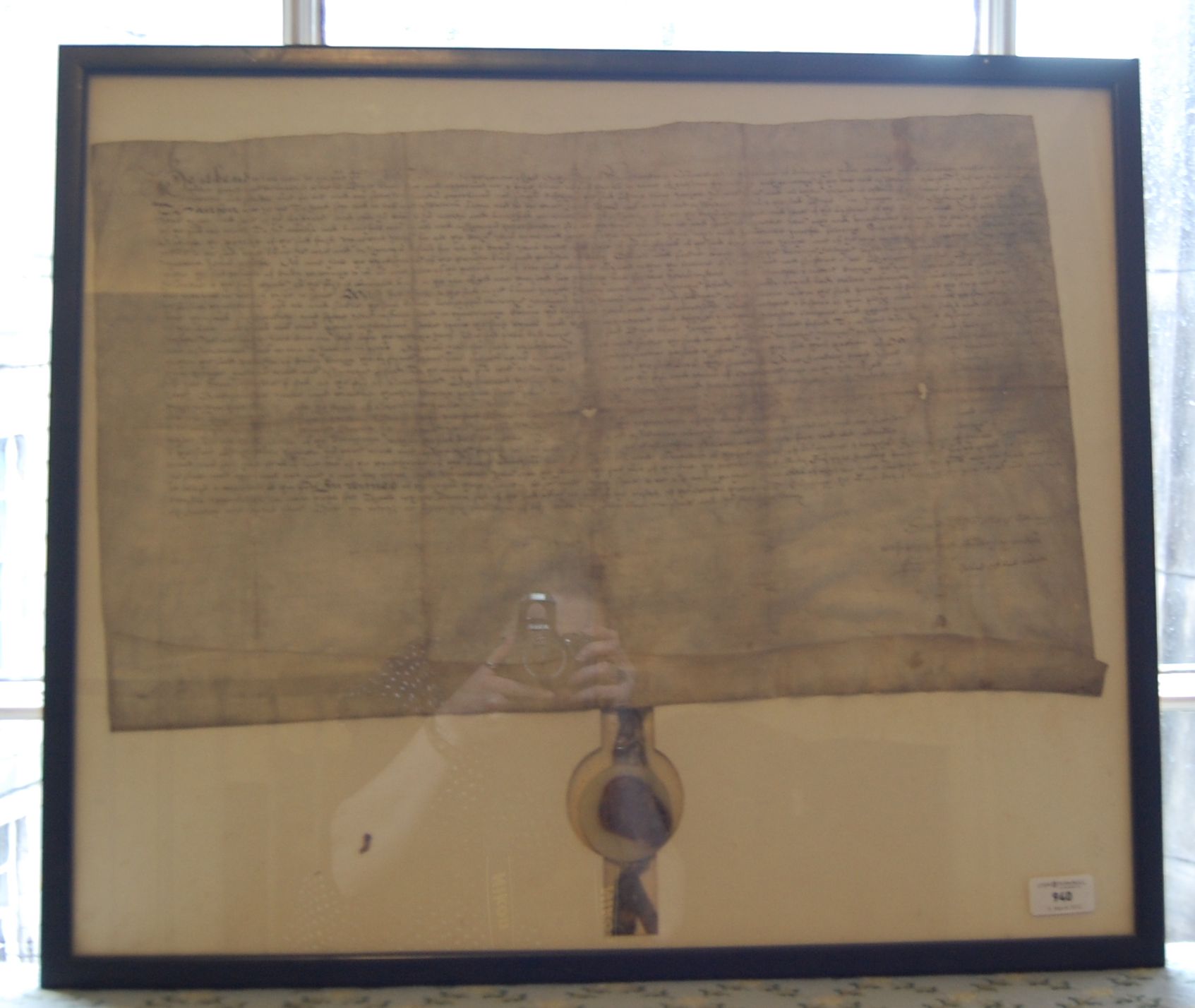 Tack of the teinds of the Parish of Dalry, granted by John Archbishop of St. Andrews, Commendator of the Abbey of Kilwinning in favour of Bryce Blair of that Ilk, younger, 30 Nov. 1616, vellum document with seal, signed by St. Andrew, Abbot of Kilwinning, Mr John Hay & others, 56 x 34cm, small hole at centre affecting a few letters, framed and glazed