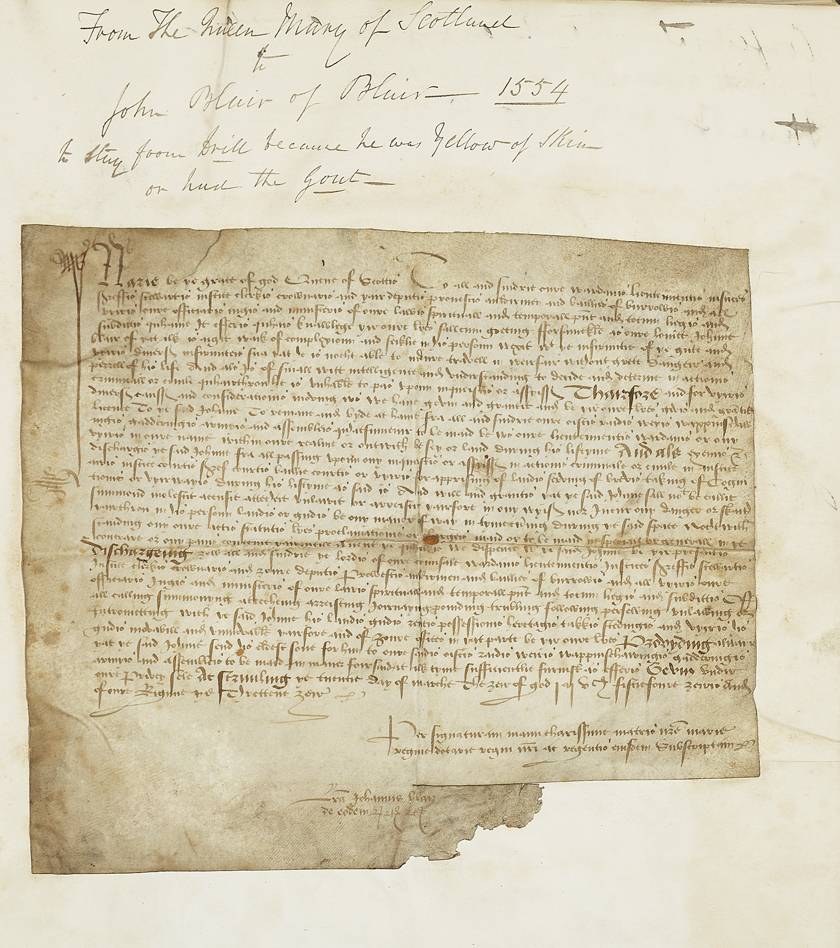Note: The document exempting John Blair from service would probably have been signed by Mary of Guise who was Mary Queen of Scots' regent from 1554 to 1560. Mary would have been thirteen years old when the document was signed in 1554.