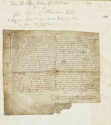 An album of manuscripts relating to Blair of Blair, 15-18th century, including: a document [unsigned] from Mary Queen of Scots granting license to John Blair of Blair to stay at home as he is "weak of complexion, sickly in person with the infirmity of the gout and is not able to travel without danger and peril to his life… Given under our Privy Seal at Stirling, 20 March 1554 in the 13th year of our reign", vellum, 21 x 24cm., probably with signature cropped at head;