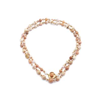 A 9ct yellow gold citrine, rose quartz, and Scottish freshwater pearl necklace