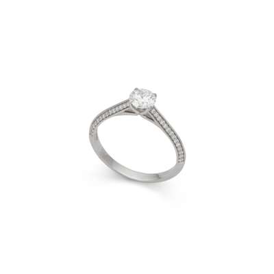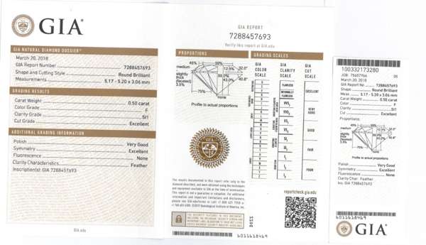 Accompanied by a GIA report no. 7288457693, dated 20th March 2018, stating that the round brilliant-cut diamond, weighing 0.50cts, is F colour, SI1 clarity, with no fluorescence