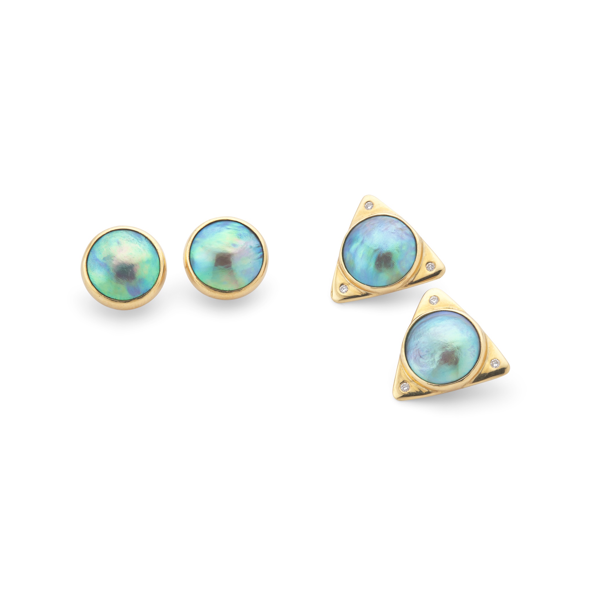 The first pair each collet-set with a blue-green mabé pearl; the second pair also set with a blue-green mabé pearl in a triangular border set with three small round-cut diamonds; both with post and butterfly fittings, UK hallmarks (2)