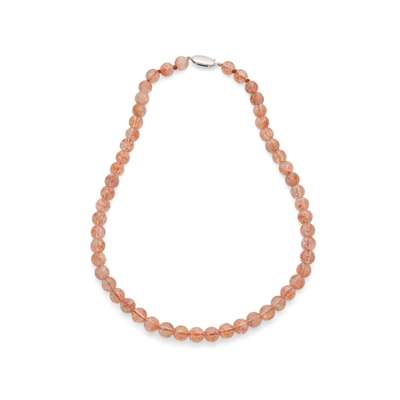Composed of a single row of polished sunstone beads, to a ribbed oval clasp, stamped Au375