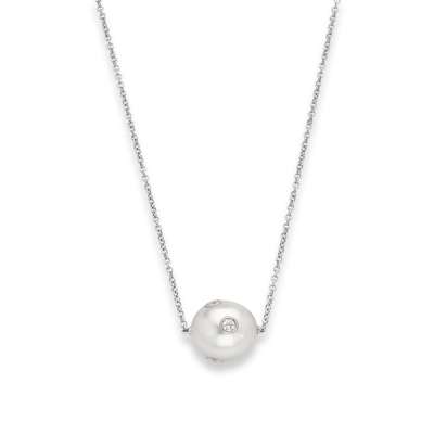 The South Sea pearl inset with five round brilliant-cut diamonds, to a trace-link chain, stamped 750
