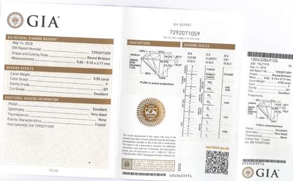 Accompanied by a GIA report no. 7292071059, dated 14th May 2018, stating that the round brilliant-cut diamond, weighing 0.50cts, is F colour, SI1 clarity, with no fluorescence.