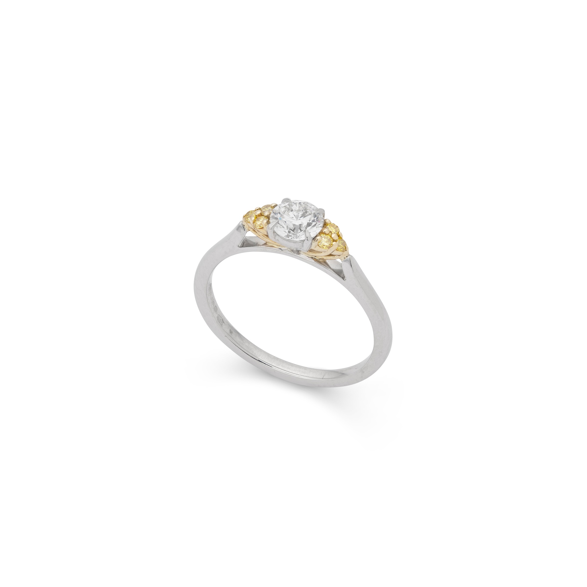Claw-set with a round brilliant-cut colourless diamond, each shoulder set with three small round brilliant-cut fancy yellow diamonds, UK hallmarks