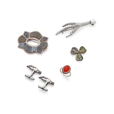 Including a pair of cufflinks, each modelled as a horse's head, stamped 925; a silver kilt-pin, modelled as a ptarmigan foot; a silver mounted carnelian ring, and two Scottish hardstone brooches, mounted in silver (5)