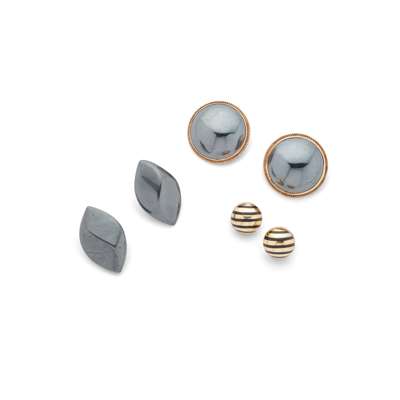 Including a pair of 9ct gold cabochon hematite earrings in a rope-twist border; a pair of shaped hematite earrings, unmarked; and a pair of black enamel domed earrings, unmarked; all with post and butterfly fittings (3)